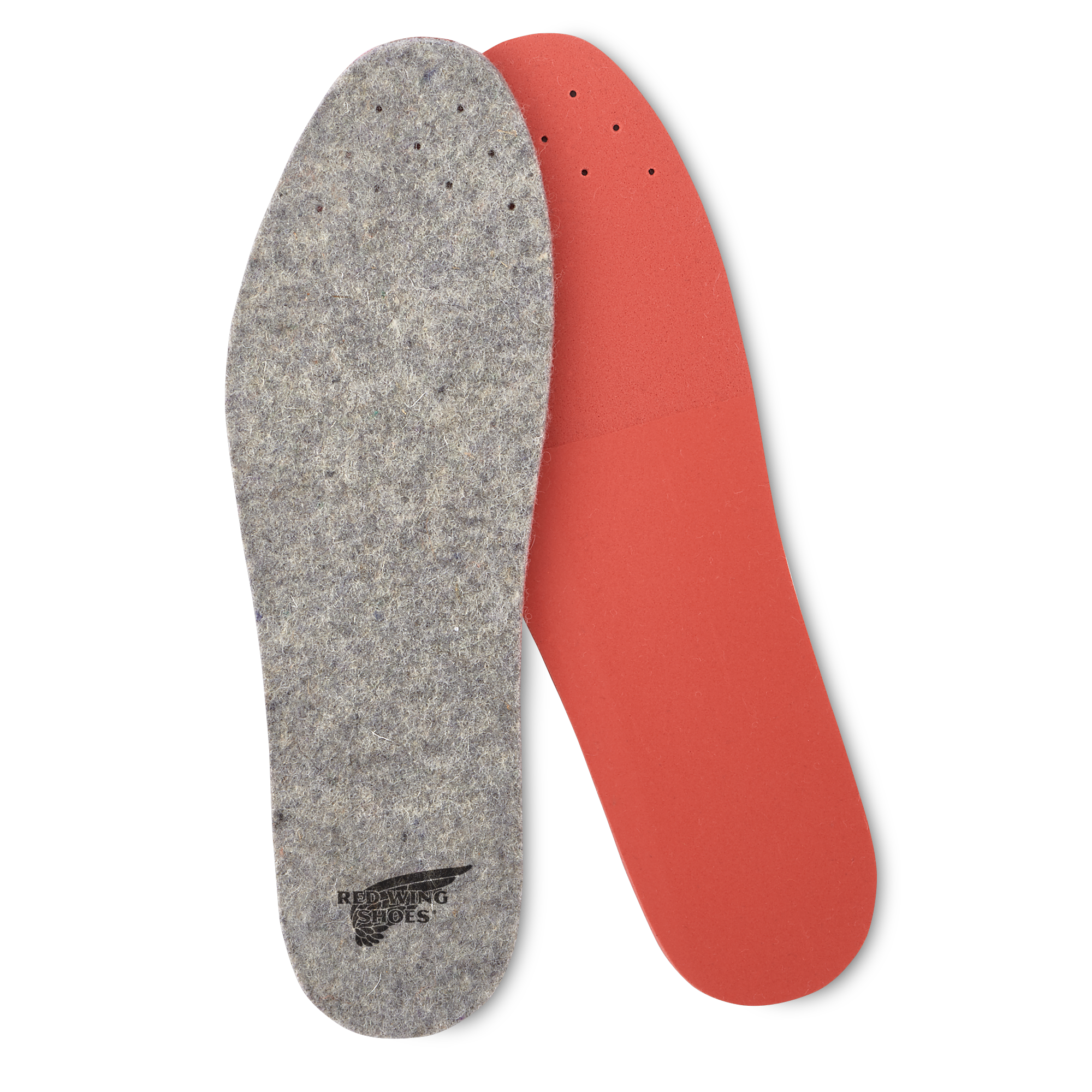 Red Wing Wool Shaped Comfort Footbed has a warm moisture wicking wool felt top surface and the same density of light weight cushioning Poron for that cushioned feel .
